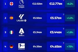 五大联赛球队总身价榜:英超遥遥领先,西甲次席,意甲第三